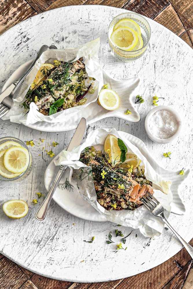 A very tasty and healthy lunch with the minimum fuss preparation and cooking, leaving the kitchen and oven clean. Serve straight from the parcel.