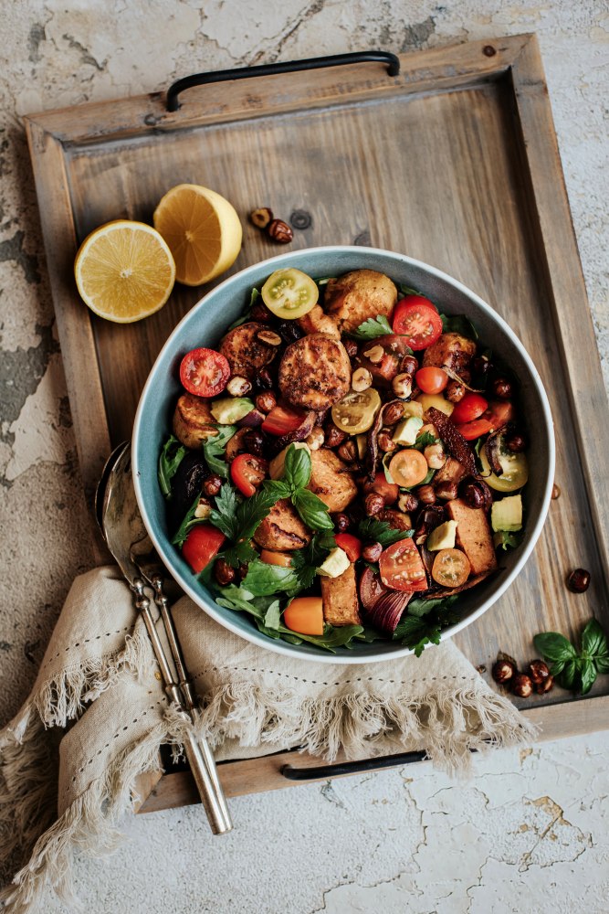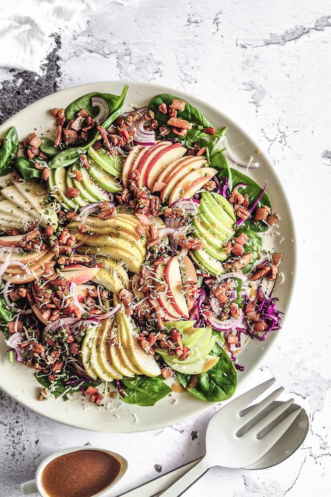 Sweet and savoury candied bacon and pecans combine with crunchy red cabbage and crisp apple in this spinach salad. Finish with a sprinkle of freshly