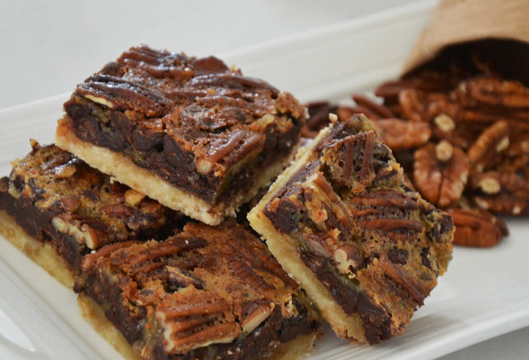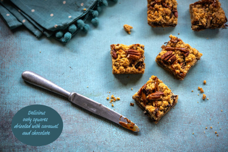 Oaty squares filled with caramel and chocolate chips and topped with pecans for a delectable treat.