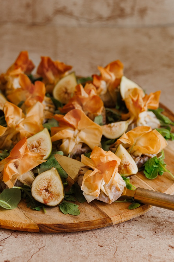 A delicious creamy pastry with sweet pear and salty prosciutto.