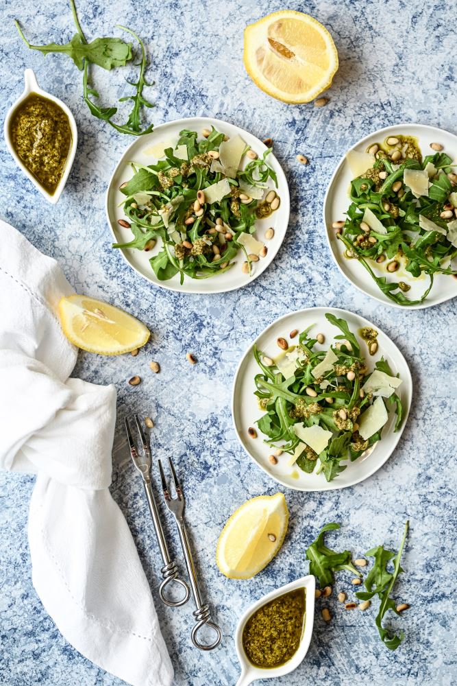 Peppery rocket, bright lemon and nutty pesto combine to form a vibrant and tasty salad.