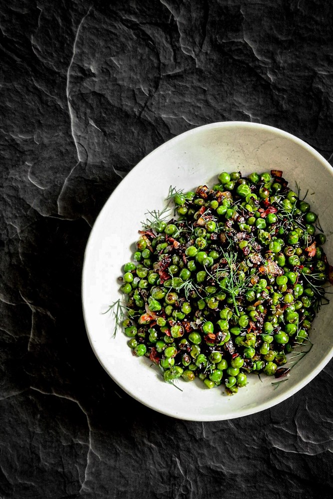 Tender yet crispy green peas fried in butter with bacon and onion and garnished with dill.