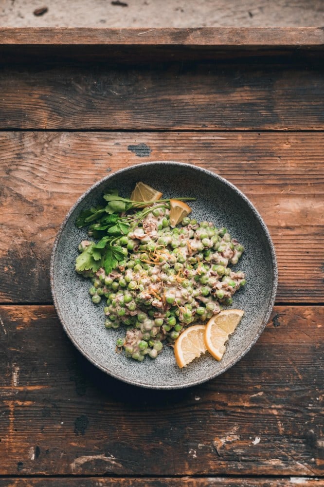 Tender yet crispy green peas fried in butter with bacon and onion and garnished with dill.