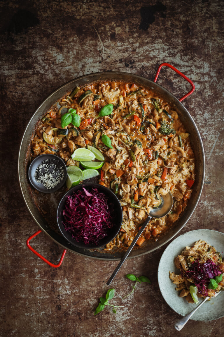 Fragrant and flavoursome, this one pan chicken meal is served with an Asian-inspired salad alongside. Dinner. Sorted!