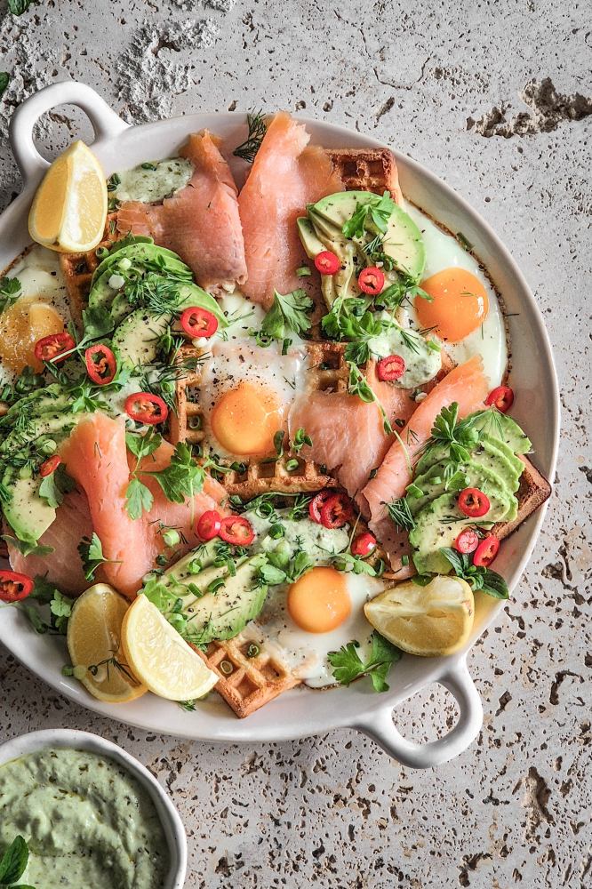 Wow your guests with this deluxe breakfast of smoked salmon, eggs, waffles and avo – a veritable kaleidoscope of flavours and colours.