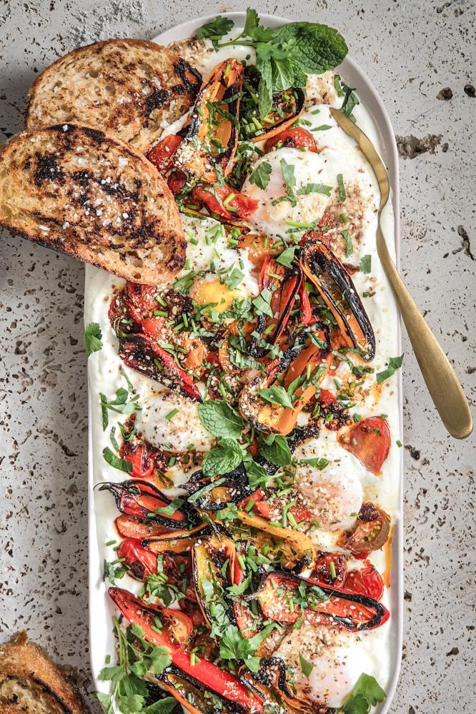 Poached eggs on a garlicky Greek yoghurt base, with charred capsicums, a sprinkle of dukkah and crusty toasted sourdough slices…