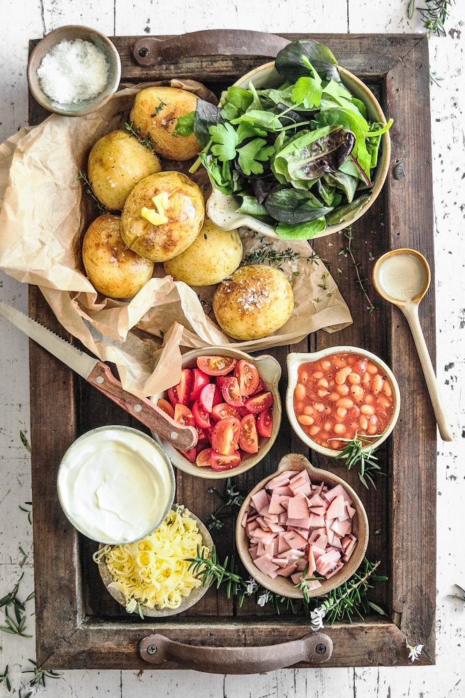 An easy and popular lunch; serve potatoes in their skins with various fillings and toppings of your choice.