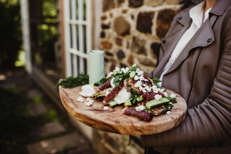 Delicious lunch option with stacks of flavour. The savoury cheesy pancakes are folded over a tomato and bacon filling served with whipped feta for a