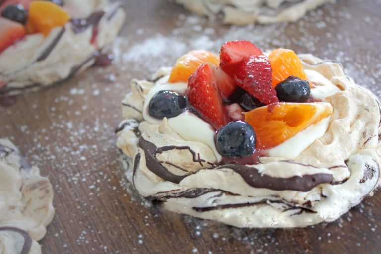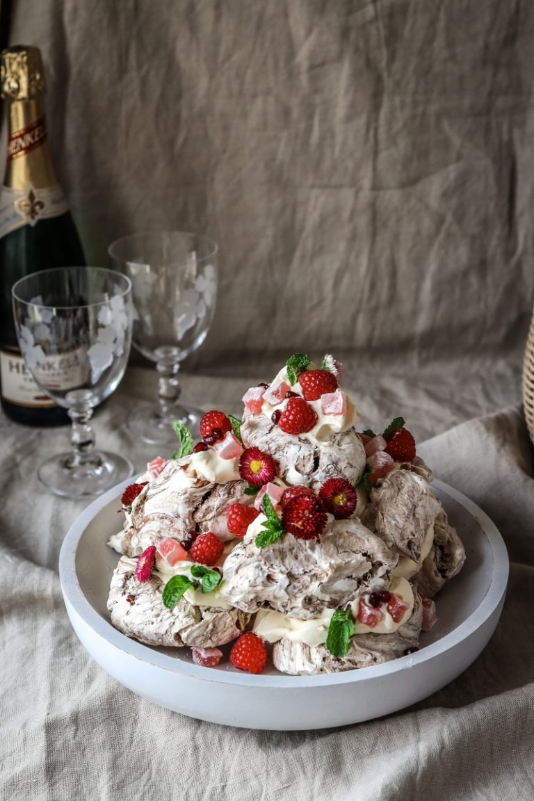 Delicate discs of meringue stacked with a silky mocha mousse.