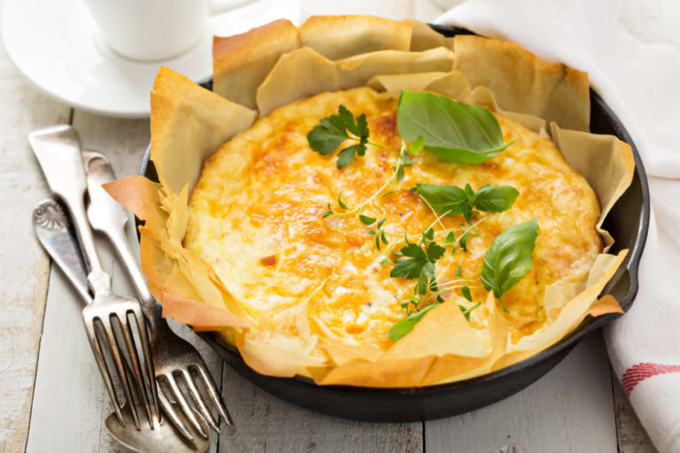 A beautiful golden brown, cheese and onion, crustless pie that will please the whole family.