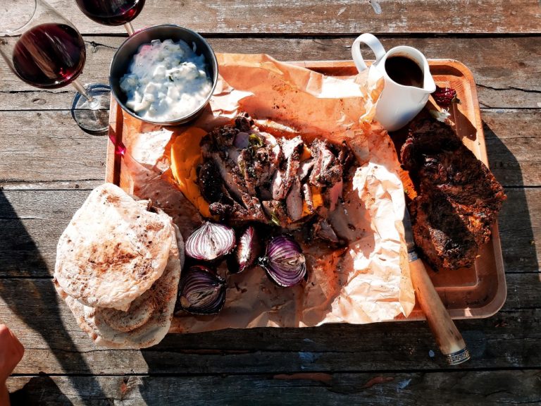 This recipe involves butterflying and skewering a whole lamb leg – alternatively you can roast the lamb leg whole in the oven, and the rub