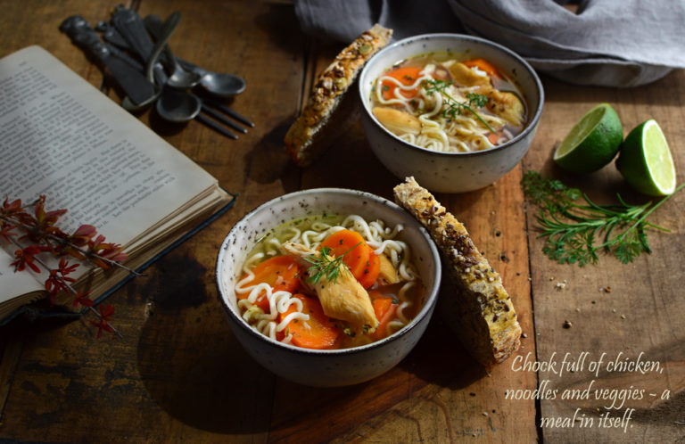 A simple but tasty soup made in the slow cooker. Add the noodles half an hour before serving.