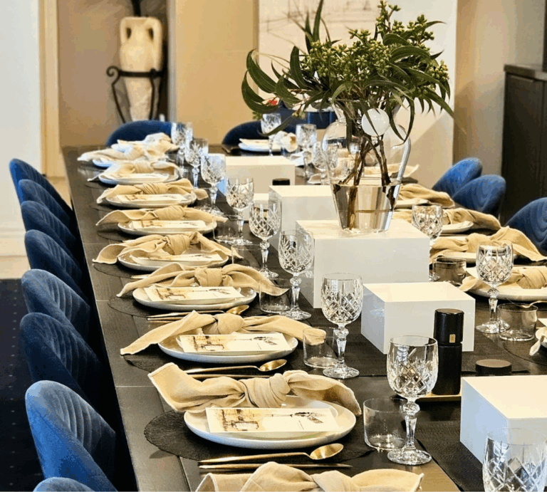 Personalise the details: No two of my tables ever look the same. It’s very difficult to recreate the same setting, because of the personalised details that each table has. In this particular setting, I added a small jar of mini matches to light the candles. I’ve also added some small stone fruit and pears in a textured metal bowl for interest and to add a provincial aesthetic. I used a wooden and linen cloth to hold the loaf of bread. It’s most important to not over clutter the space with random items. The goal is to use details that are both a thing of use and a thing of beauty.Â