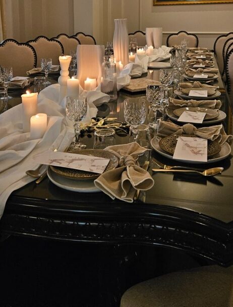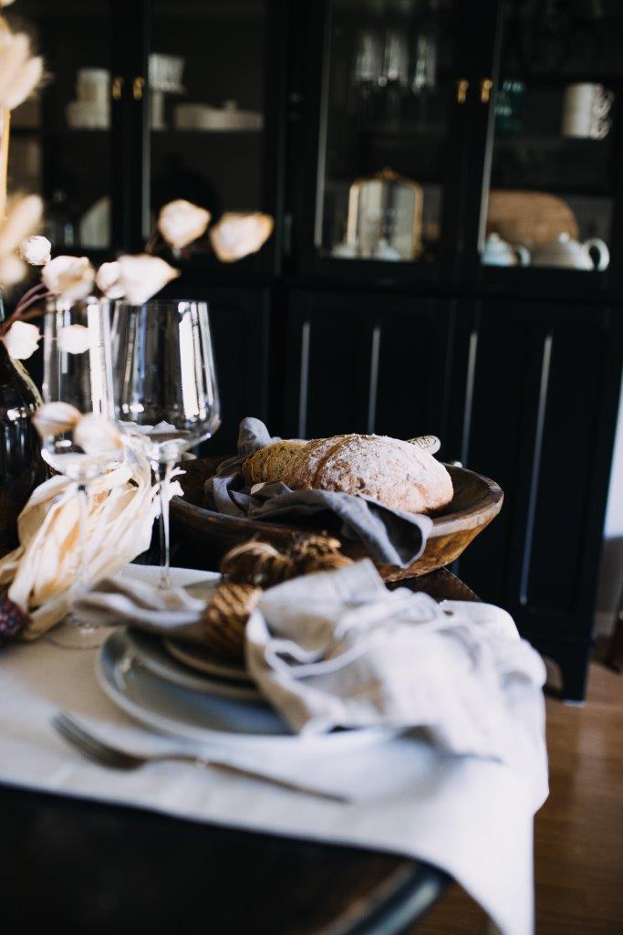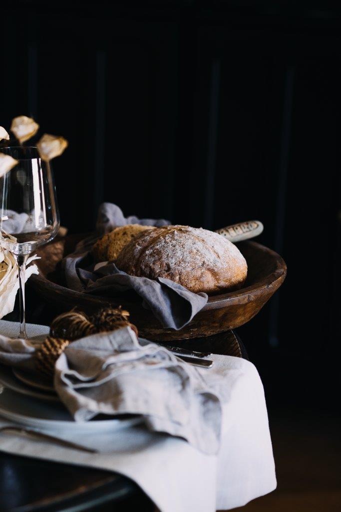 Personalise the details: No two of my tables ever look the same. It’s very difficult to recreate the same setting, because of the personalised details that each table has. In this particular setting, I added a small jar of mini matches to light the candles. I’ve also added some small stone fruit and pears in a textured metal bowl for interest and to add a provincial aesthetic. I used a wooden and linen cloth to hold the loaf of bread. It’s most important to not over clutter the space with random items. The goal is to use details that are both a thing of use and a thing of beauty.Â