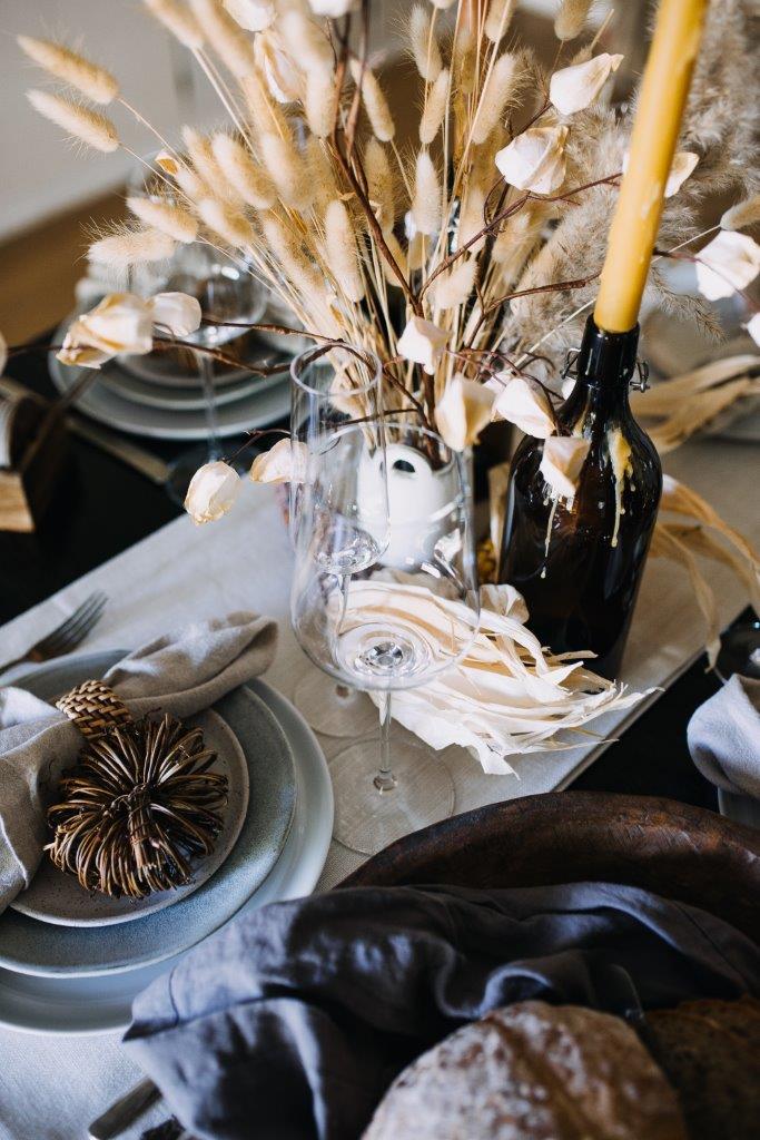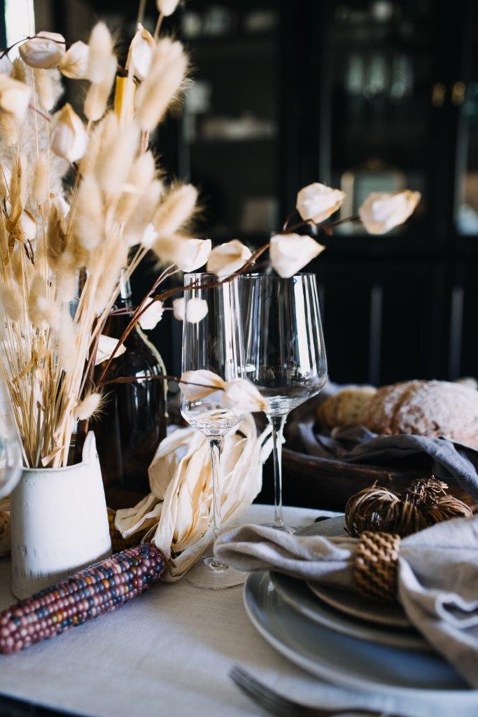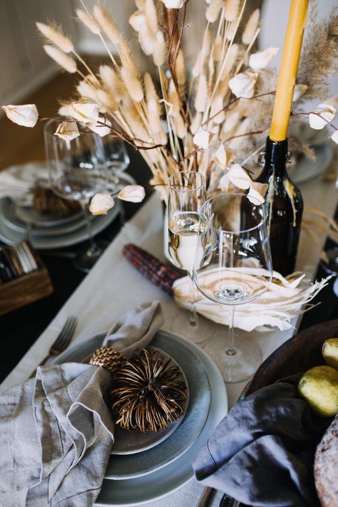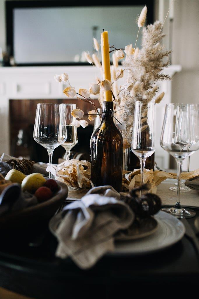 Curate your centrepiece: I’ve used a mix of dried and artificial foliage here. The key with artificial foliage is to get the stuff that LOOKS real. One way to do this is to steer away from the unnaturally coloured items (unless that’s your vibe). I shopped the foliage at my local arts and crafts store, but you can also just go outside and pick up anything you find along the road. If you are using real flowers or foliage, take care that they are properly watered and won’t suddenly wilt when it comes to mealtime. Make sure you incorporate a variety of textures and heights in your floral arrangements, whether they are dried or fresh. I have also used a small collection of dried corncobs from last year’s decorations. These are real items that you can find either in large supermarkets, at a crafting store, or even online. Candles are also an obvious part of the occasion, but since I didn’t have a traditional votive or candle holder, I sourced some inexpensive brown glass bottles and fitted the candles into the spouts. Of course, if you have candle holders that fit the theme, you could use those as well. I didn’t happen to have any the right height!