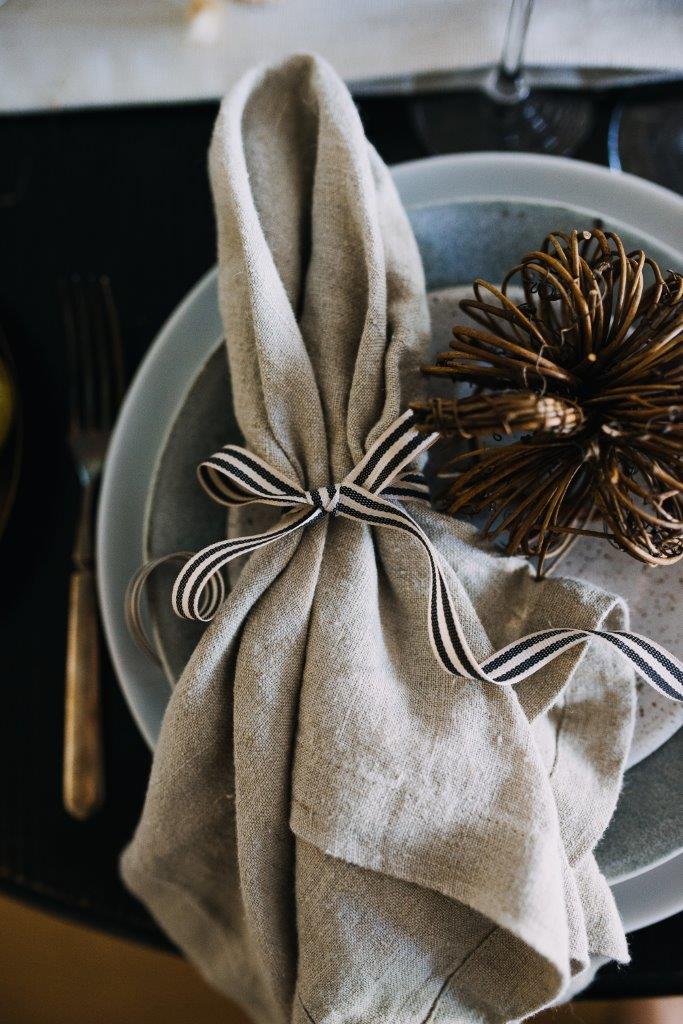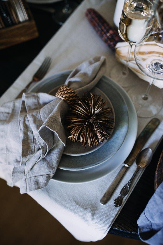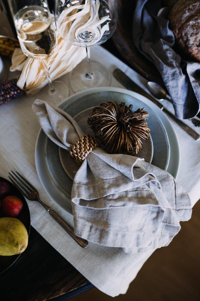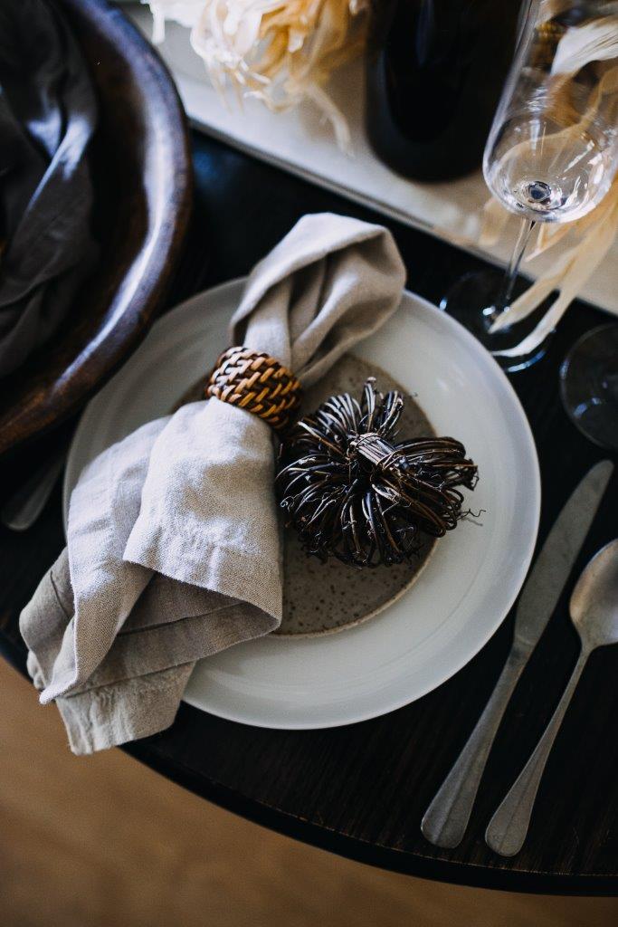 Now for linens: To tie in the linen table runner, I have used a beige linen serviette threaded through a woven ring. There is no pattern on the serviettes or the table runner so I’ve chosen the woven ring to add texture and interest to the setting. If you have a patterned serviette, consider using a simpler ring or just folding or tying it. Ribbons are also a great way to add interest and incorporate pattern and texture. Experiment with different widths, colours, patterns and materials to get a unique look. In this look, I’ve incorporated a small wooden pumpkin at each place. These were left over from a wreath that I had made several months ago, so I simply bent the wire back underneath them to hide it. I could have also used real pumpkins, a small bunch of colourful leaves tied together, a pinecone, a small twig to hold a name card, or pretty much anything close to hand that wouldn’t have made a mess on the plate.