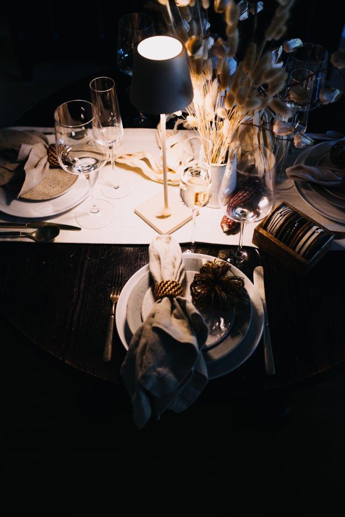 Lamps are also a great way to light your table. I have used a battery-operated lamp here, but really any small lamp would do as long and you are able to hide the cord by tucking it under the runner or decoration. Adding a dim light source adds that warm and intimate quality that is otherwise challenging to create.