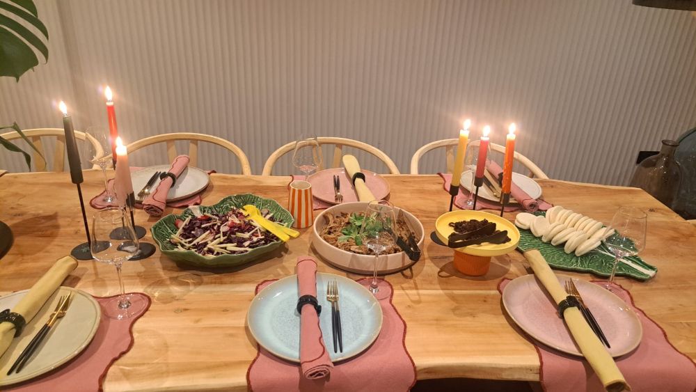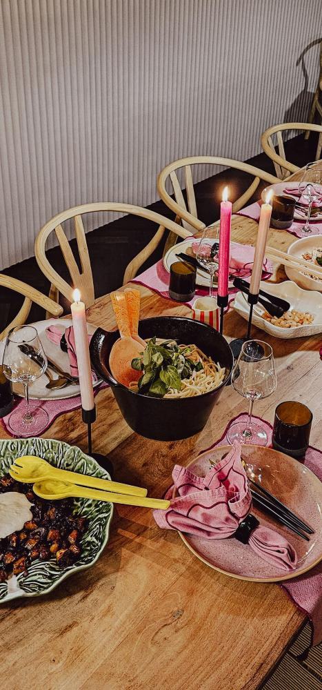 Layer coloured candles with bold candle holders, set out different coloured plates, and serve from statement dishes—like a glossy green leaf platter or a cabbage-shaped salad bowl. Add a dash of whimsy with bright napkins and tableware that celebrates your eclectic taste.