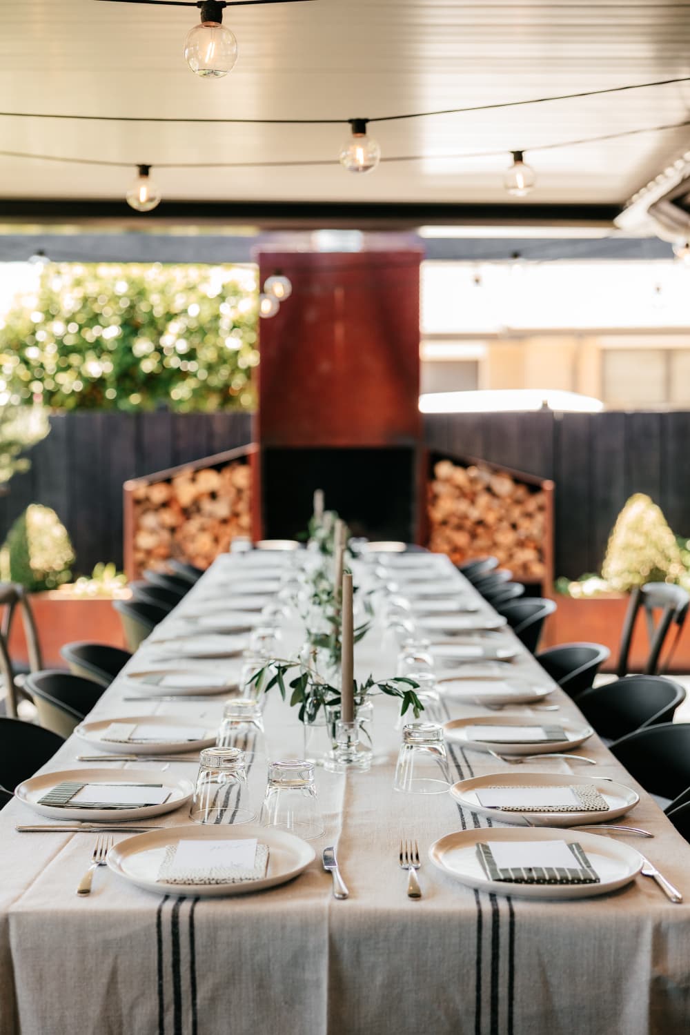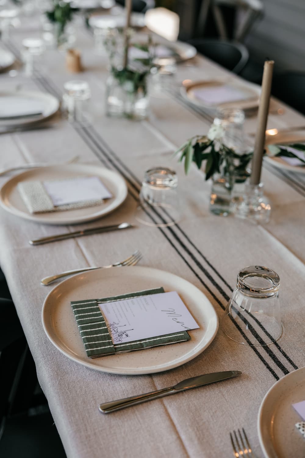 Take a large white or neutral colour tablecloth (yes, our grandmas used proper tablecloths in their day, sometimes plain or checked, or bright with florals or made with lace) to cover the entire table. If it has a bit of pattern on, then that’s great and you can incorporate those colours into your napkins or crockery. For example, if there are a few black stripes on the cloth then you could have white plates with black and white napkins on. A matching menu card would be great too.