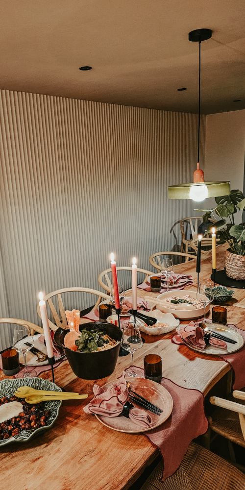 This table setting is a great example of how layering simple elements can create a polished, designer look. The foundation starts with a dark table that allows every detail to stand out—especially the crisp white blocks running down the centre. These blocks act almost like pedestals, giving height and interest without needing heavy decoration.