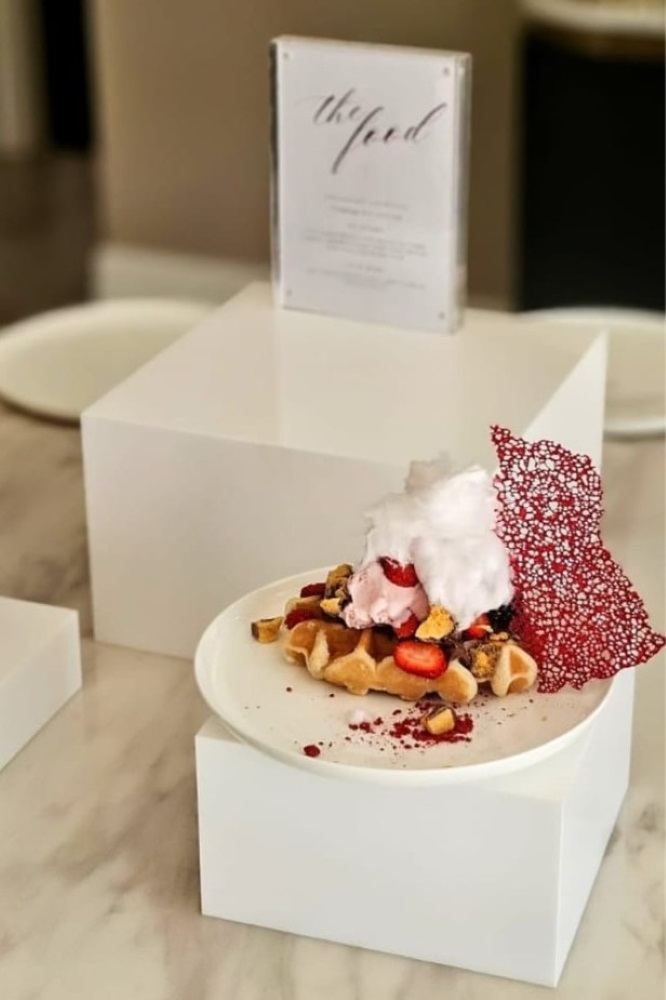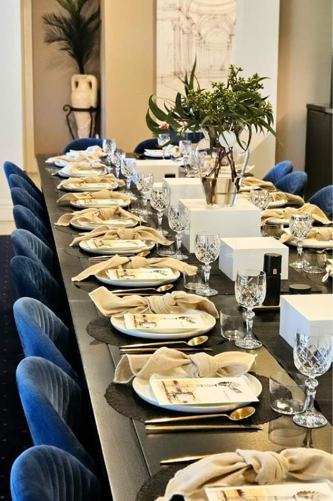 On top of a few blocks, slim gold vases hold arrangements of greenery, adding just the right touch of organic softness to balance the clean geometry. The greenery is kept loose and natural, so the look stays modern rather than overly formal. Crystal glassware and gold flatware bring sparkle and warmth, while the textured placemats ground each setting. Plates are topped with neatly knotted linen napkins and a printed menu card, tying the look together with a personal touch.