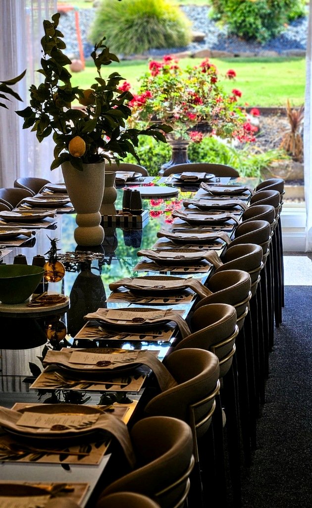You don’t need florals or heavy centrepieces. Let the repetition of place settings, textures, and natural materials do the work.