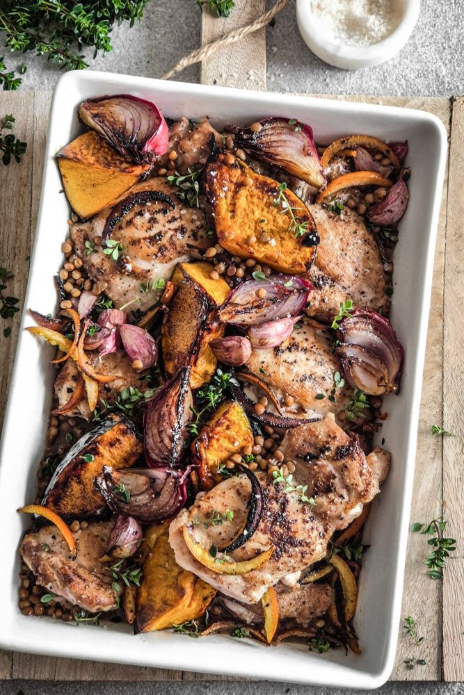Chicken and pumpkin roasted in a Marsala flavoured stock and served with lentils will soon become a family favourite.