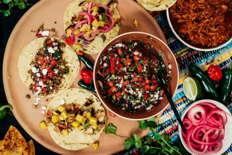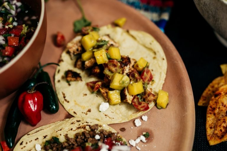 Spicy meat filled tortillas are a favourite Mexican street food. With a choice of toppings and garnishes you can personalise them to your own taste.