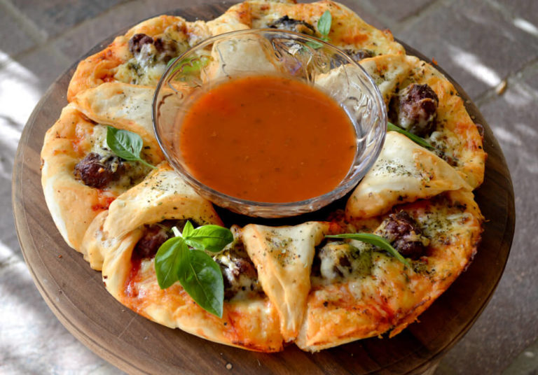 A delicious cheesy open pie with chicken, potato, mushrooms & sausage – kransky, chorizo or cabanossi! Freezes well.