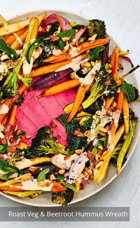 Spread beetroot hummus on a platter and place your roasted vegetables on top (see image) – an easy and delicious way to make them pop! Beetroot Hummus